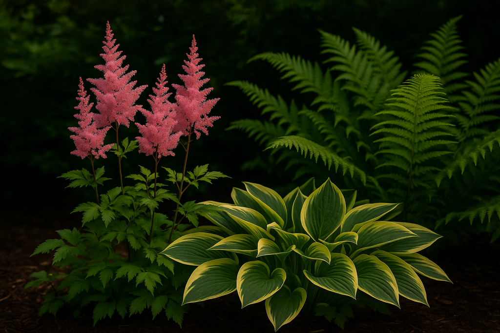 - Hostas → Their bold, textured leaves contrast beautifully with Astilbe’s plumes.