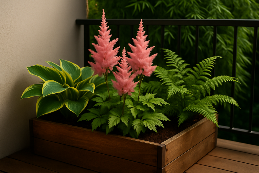 Imagine this: A shaded balcony corner bursting with soft pink Astilbes, lacy ferns, and deep green hostas — a mini sanctuary of color.