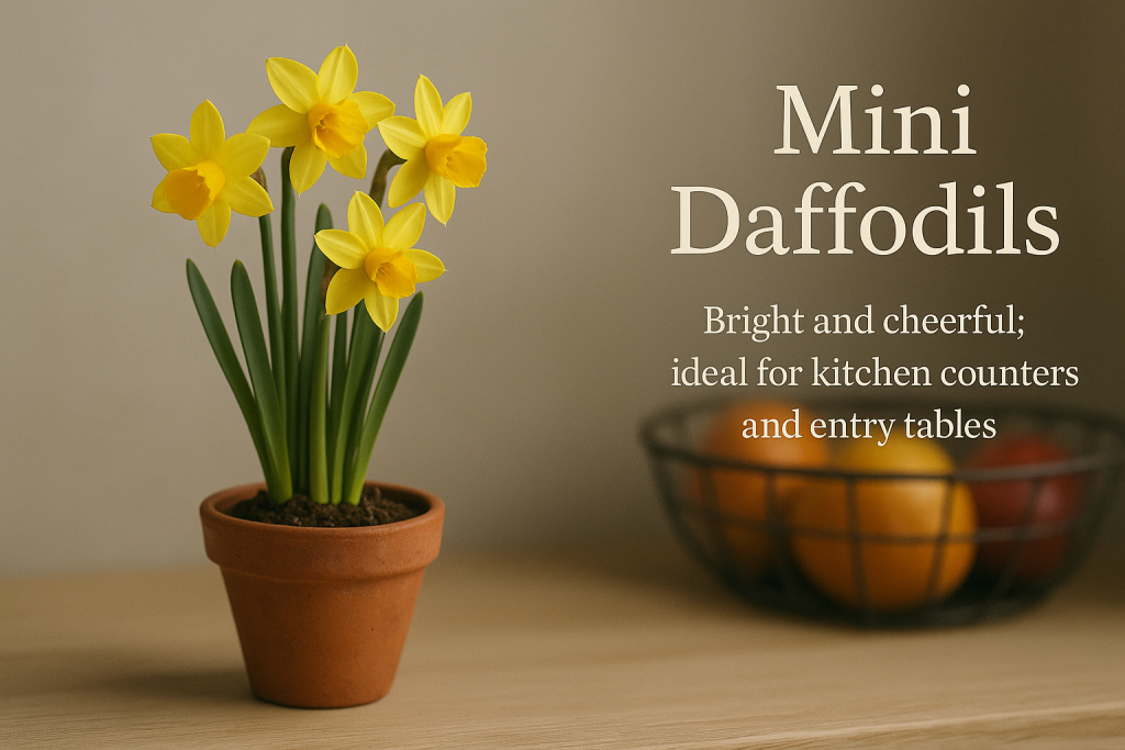Mini daffodils thrive in bathroom humidity; pair with eucalyptus.